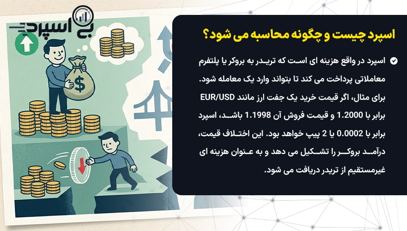 اسپرد در واقع هزینه ای است که تریدر به بروکر یا پلتفرم معاملاتی پرداخت می کند تا بتواند وارد یک معامله شود. برای مثال، اگر قیمت خرید یک جفت ارز مانند EUR/USD برابر با 1.2000 و قیمت فروش آن 1.1998 باشد، اسپرد برابر با 0.0002 یا 2 پیپ خواهد بود. این اختلاف قیمت، درآمد بروکر را تشکیل می دهد و به عنوان هزینه ای غیرمستقیم از تریدر دریافت می شود.